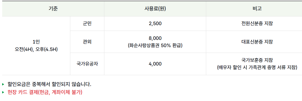 - 이용료 감면 대상자 신분증 지참(국가유공자 배우자 할인 시 가족관계 증명설 지참)
